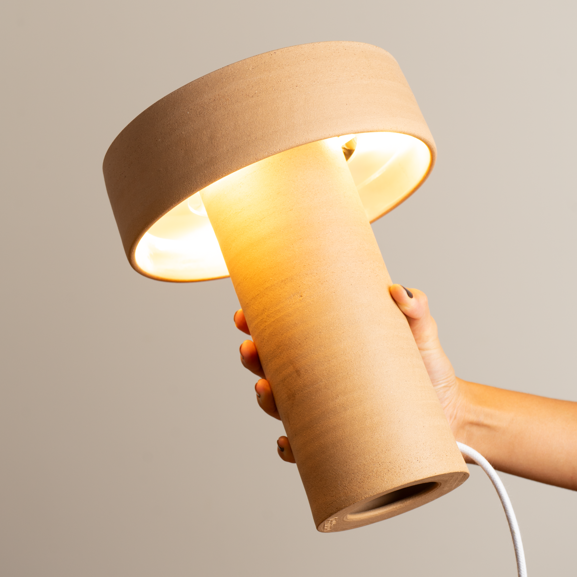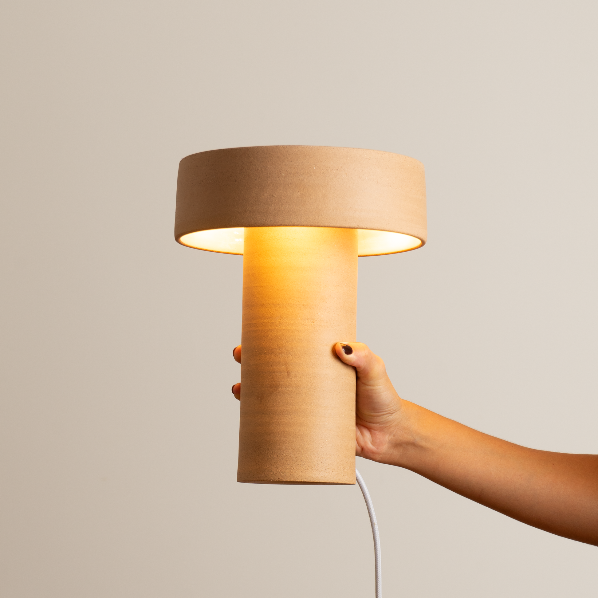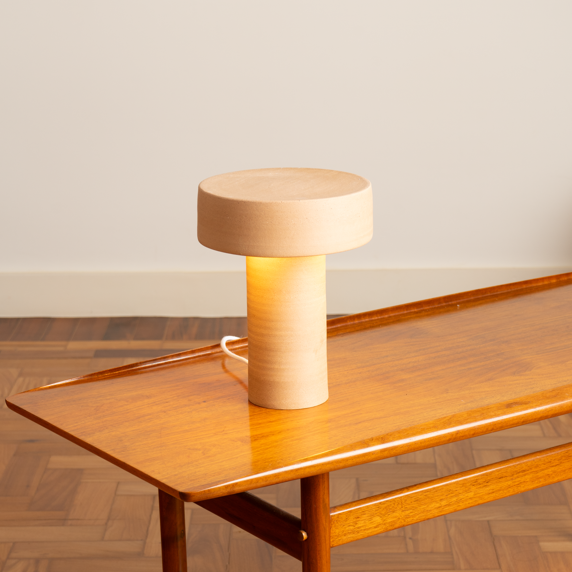 Uma luminária de mesa utilitária e escultórica, unindo formas geométricas com a técnica milenar da cerâmica. A luminária une o passado e o futuro. A rigidez da forma contrasta com a plasticidade do material e das impressões deixadas pelas mãos do ceramista.