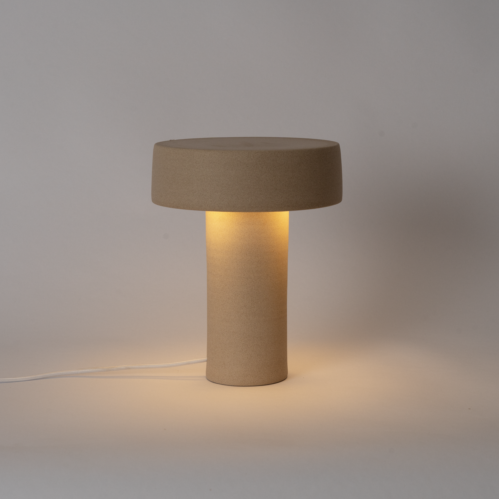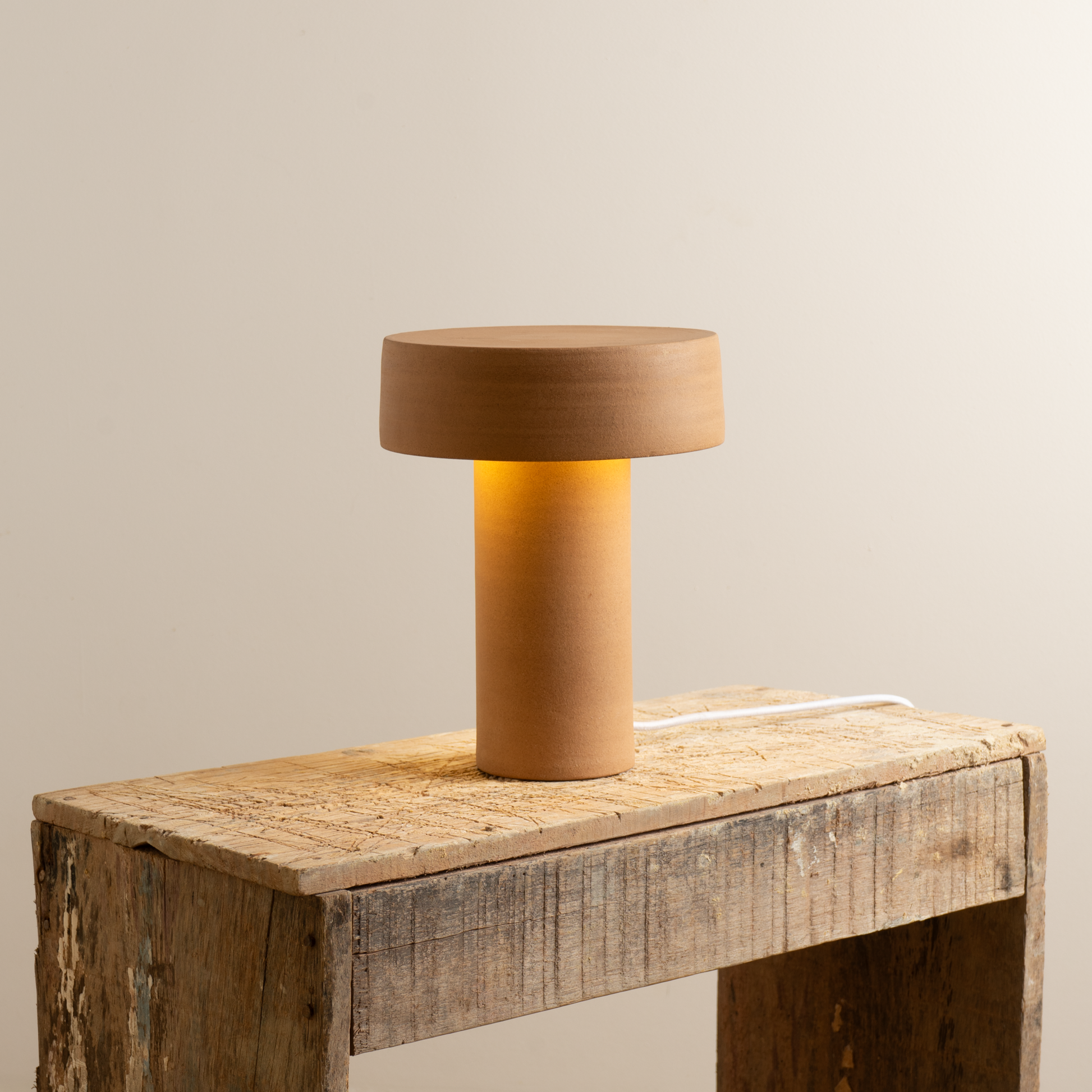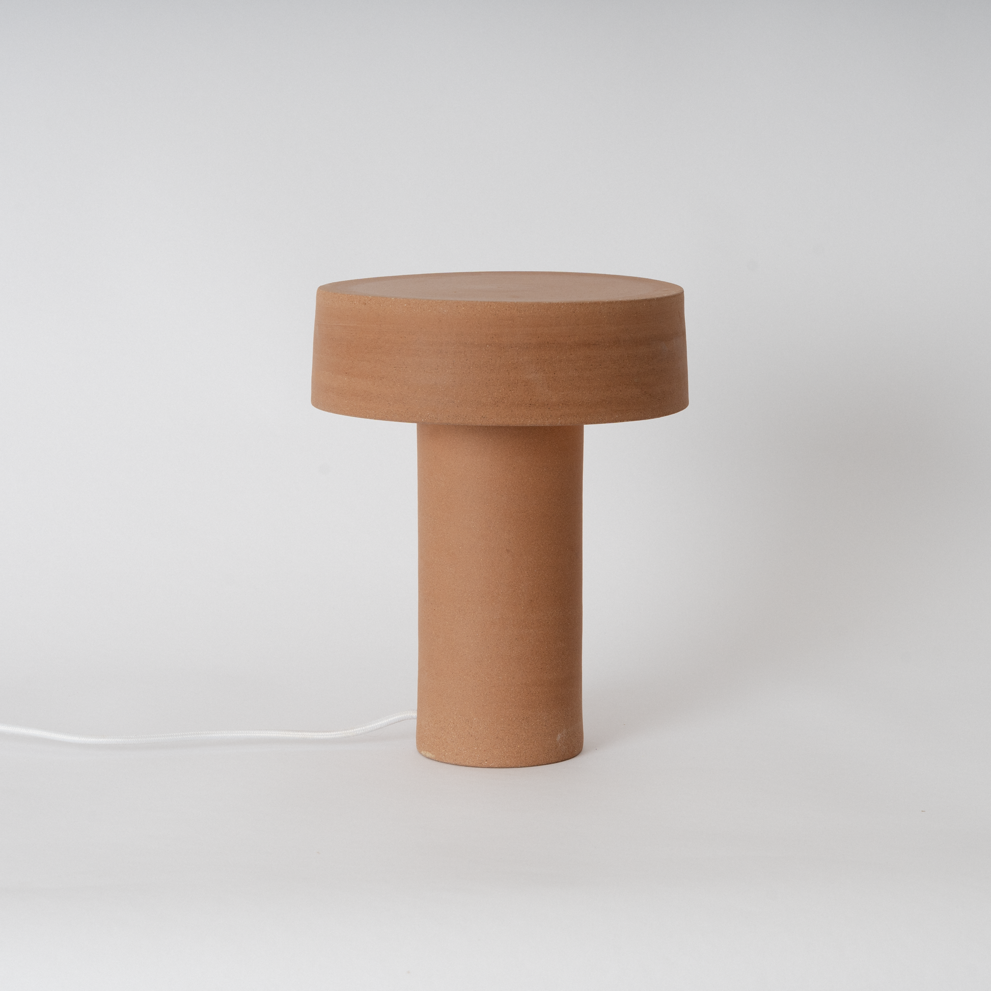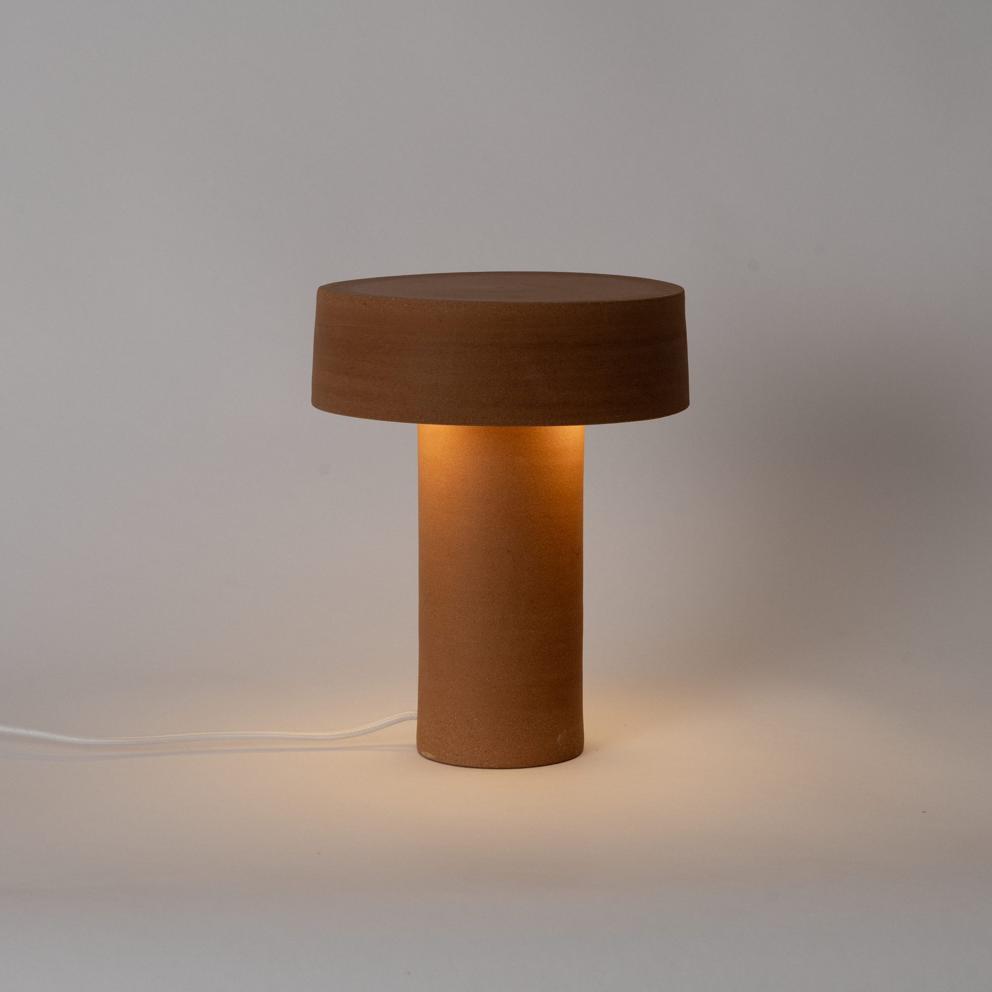 Uma luminária de mesa utilitária e escultórica, unindo formas geométricas com a técnica milenar da cerâmica. A luminária une o passado e o futuro. A rigidez da forma contrasta com a plasticidade do material e das impressões deixadas pelas mãos do ceramista.